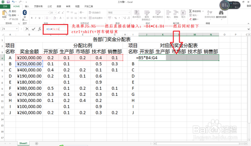 第二,计较奖金A分派到各部分的奖金数额,先选择J5:N5——然后直接在键输入:=B4*C4:G4——然后同时按下ctrl+shift+回车键竣事,这样就把奖金A分派到各部分的奖金全数统计出来。