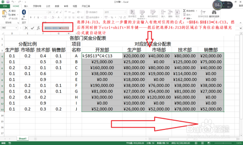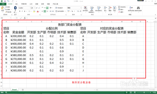 第一,实例阐发,左边的表格数据本家儿如果建造好为奖金的分派总额,然后按公司的划定建造好各部分的分派比例,然后再在右边建造一个各部分对应的奖金分派表