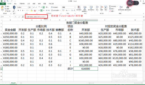 第五,用数组统计开辟部分各奖金的分派总金额。选择J14——然后输入公式:=SUM($B$4:$B$13*C4:C13)——同时按下ctrl+shift+回车键就主动统计