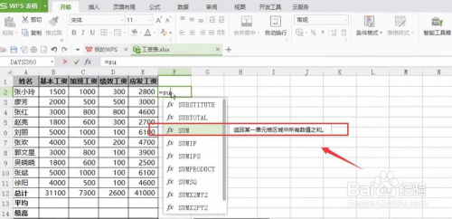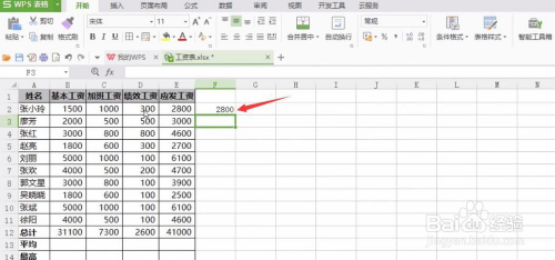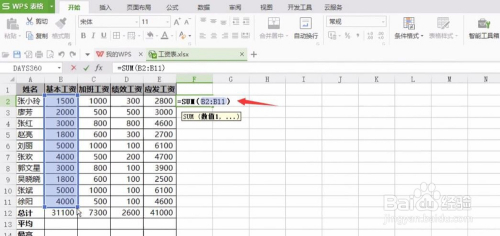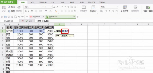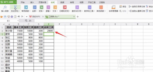 例如下图工资表,要求计较每个人的应发工资,选中E2单位格;