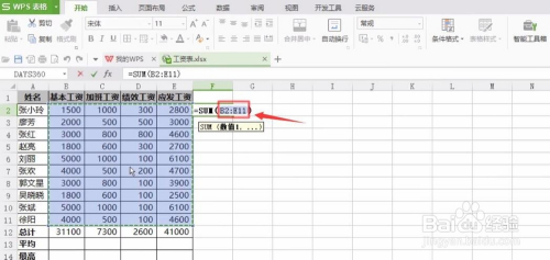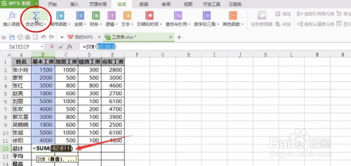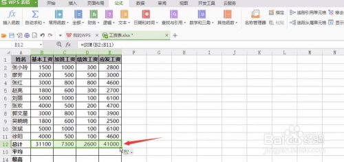 再来算工资总计,选中B12,点主动乞降,回车确认,