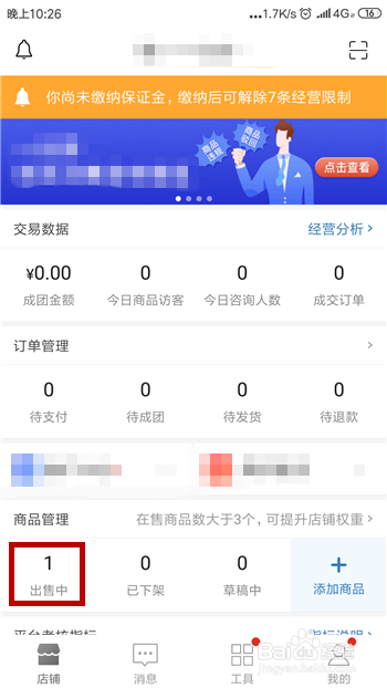 返回到首页,此时可在【商品办理】下方的出售数削减了一个,罢了下架数量多了一个。