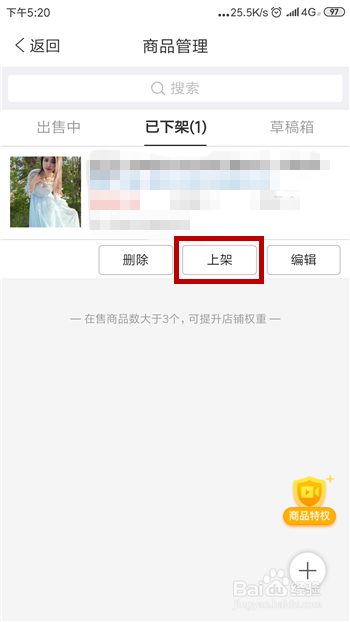 对下架的商品我们可以再次上架,只需要在已下架下方点击商品后方的【上架】即可。
