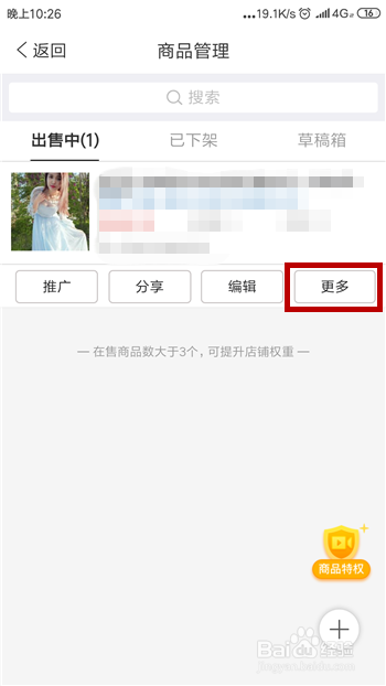 然后在【出售中】的下方就是之前我们上架的货色,点击商品后方的【更多】。