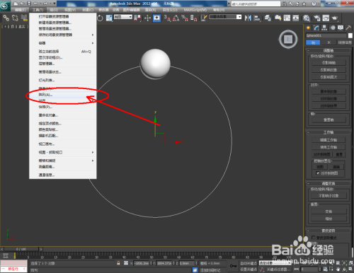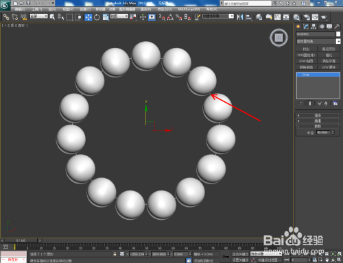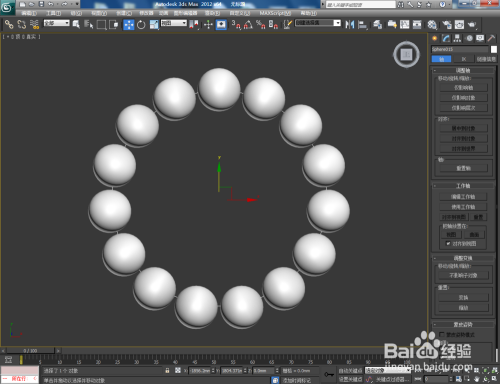 选中珠子,点击【条理】-【轴】-【仅影响轴】,将珠子的轴移动至系带圈的中间点;点击【东西】-【阵列】,弹出阵列对话框,将z轴设置为360,数目设置为15后点击确定;