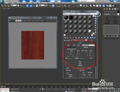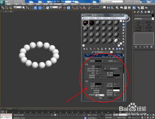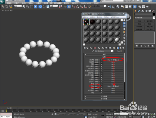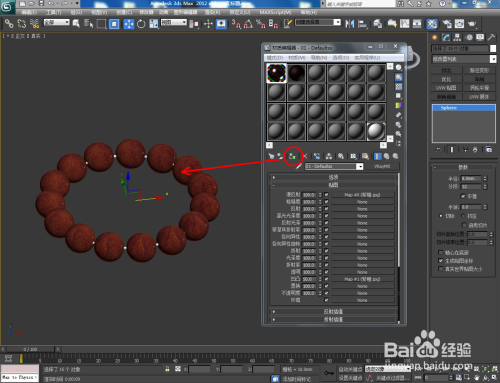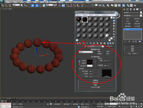 点击【材质编纂器】,弹出材质编纂器设置栏,按图示参数设置一个紫檀木材质球并添加上紫檀木贴图,设置好贴图的凹凸值后,将材质球附加给珠子模子;