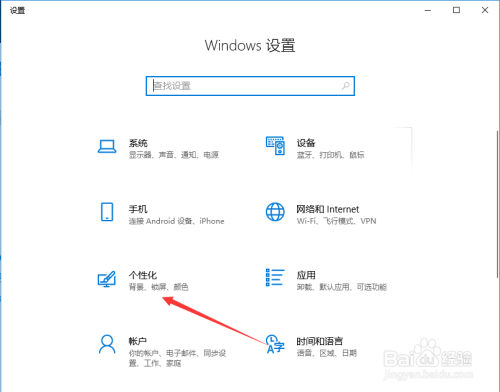 然后会弹出Windows设置弹框,选择此中的“个性化”,如图所示。