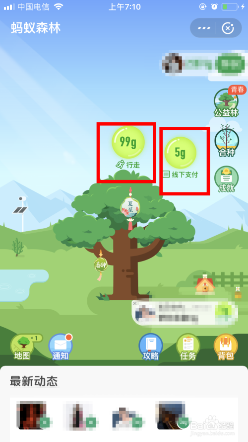 进入 蚂蚁丛林 本家儿页面后,可以看到有两个即将当作熟的能量球。点击 背包 。