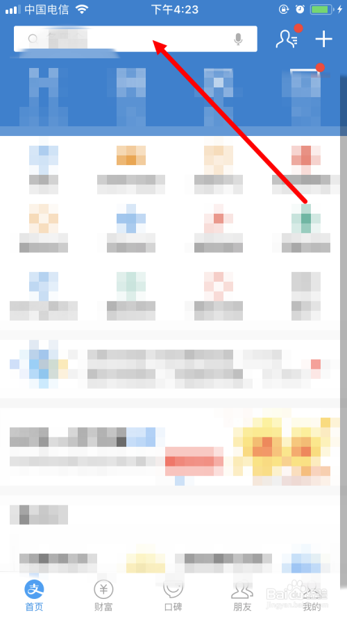 首先在手机上打开并登岸支付宝App,并在首页面点击最上端的搜刮栏。