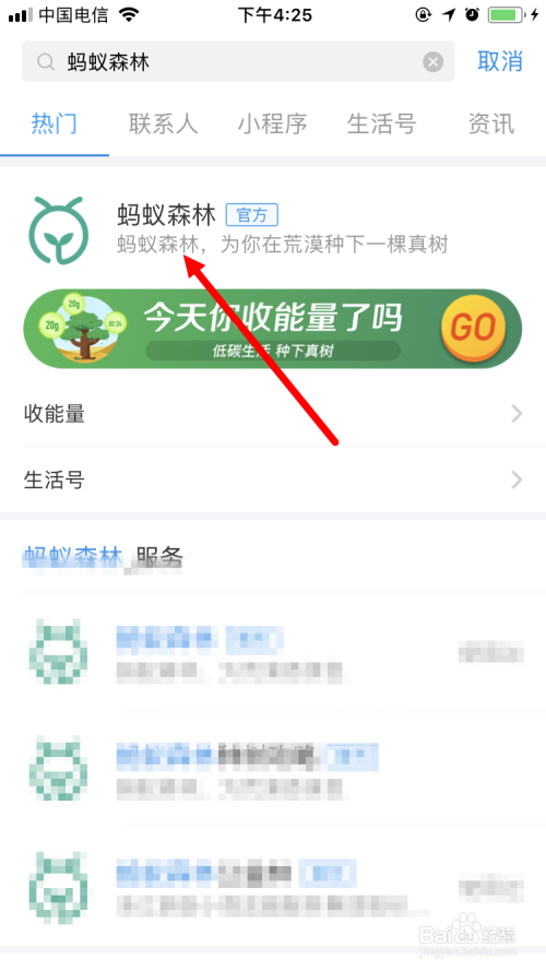 然后在搜刮栏里面输入 蚂蚁丛林 ,点击第一个搜刮成果。