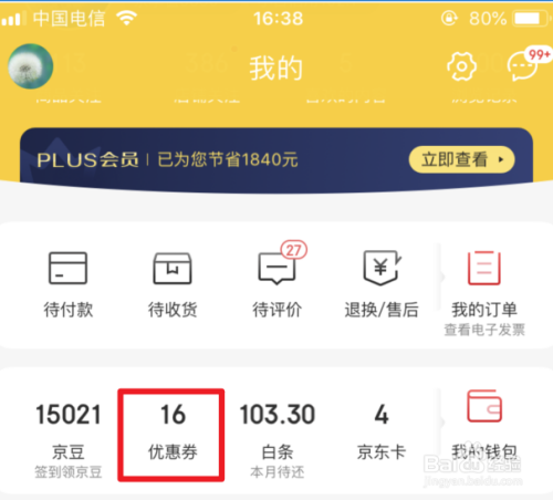点击进入小我中间界面后,我们点击优惠券的图标进入。