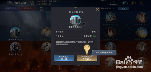 我们点击耗损先天5,可以将建筑手艺晋升至满级,后面我们将按照自身环境来点先天。