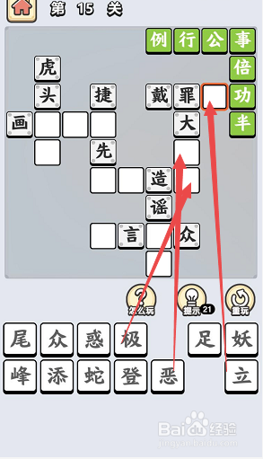 然后会定位页面中的“戴罪”右侧的空格,点击底部列表内的“立”字,完当作当作语“戴罪建功”的填写,然后跟着定位酿成“罪大”下面的两个空格之后,一次点击底部列表内的“恶”字和“极”字,完当作当作语“十恶不赦”的填写。