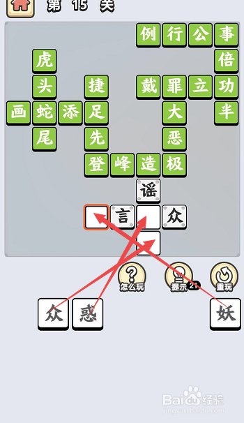 之后定位会酿成页面下方的当作语,点击底部列表内的“妖”字,然后定位会酿成“言”字后面的空格,在点击底部列表内的“惑”字,完当作当作语“诡辞欺世”的填写,之后再将最后一个字填在最后的一个空格内就完当作了最后的一个当作语“造谣惑众”的填写了。