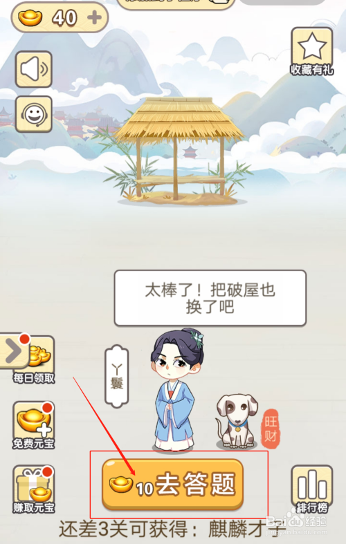 首先进入游戏,点击“去答题”,注重每次答题是要耗损10元宝的噢,所以要多赚点元宝