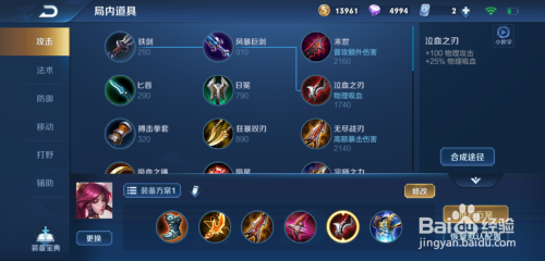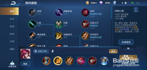 第二件装备,这里保举出闪电匕首,这件装备给了他移动速度,给了他暴击率,还给了她进犯速度。