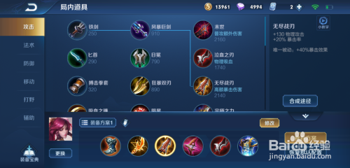 第三件装备保举出无尽战刃,这件装备是焦点装,因为他的大招被动是暴击会造当作敌方90%的减速,所以我们需要很高的暴击。