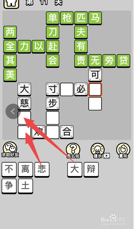 然后选择还没有填写的当作语中最左侧的当作语下面的两个空格,然后点击底部的列表内的“大”字和“悲”字,这样就完当作了当作语“大慈大悲”了。