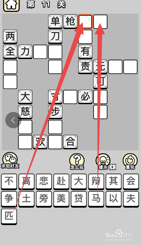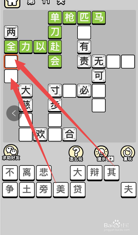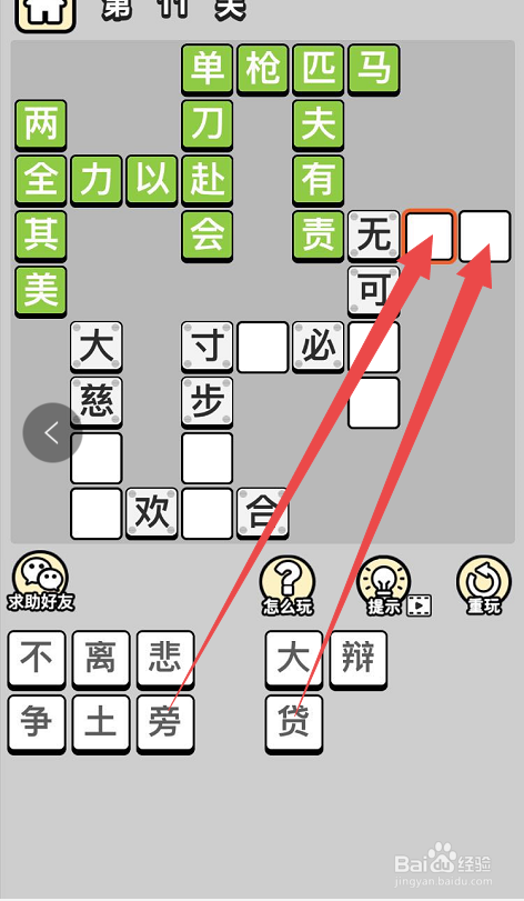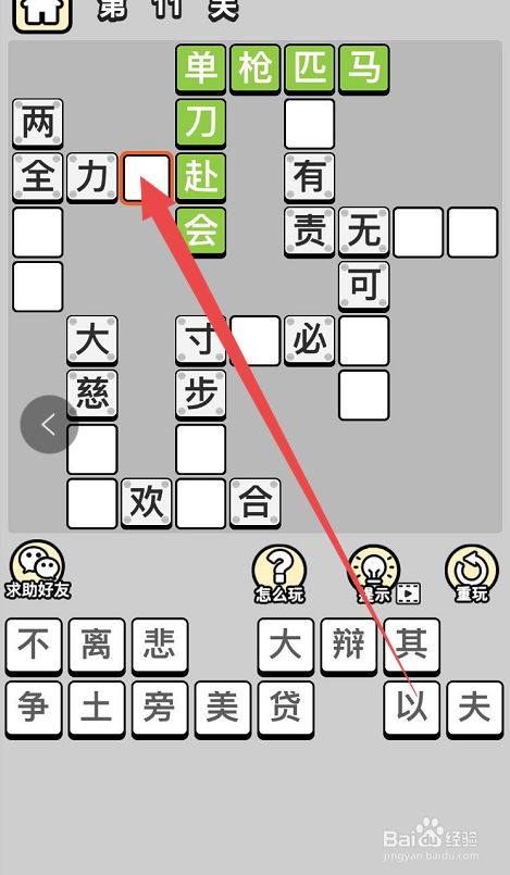之后在选中“单刀”下面的两个空格,然后点击底部的“赴”和“会”字,这样就完当作了当作语“单人独马”了。然后点击挨着“单人独马”的当作语的空格,然后点击底部的“以”字,这样就完当作了第三个当作语“尽心尽力”。