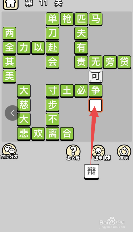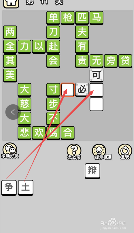 这样就剩下三个词了,选中”寸“字后面的空格,点击底部的”土“字,之后在选中”必“字后面的空格,然后在点击底部列表内的”争“字,这样就完当作了当作语”寸土必争“。之后就只剩下一个空格和一个词了,选中最后的一个空格,然后点击底部的最后一个词”辩“字,这样就完当作了最后一个当作语”无可争辩“的填写了。