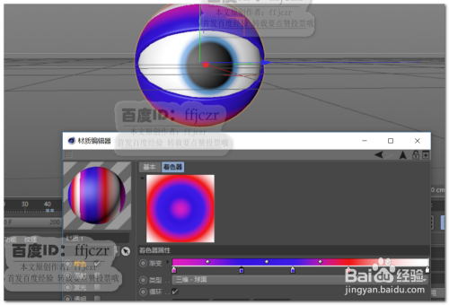 建立材质,在颜色通道的纹理中添加渐变,在渐变着色器中添加一系列颜色(如图所示),类型为三维-球面。将材质付与上下眼睑。