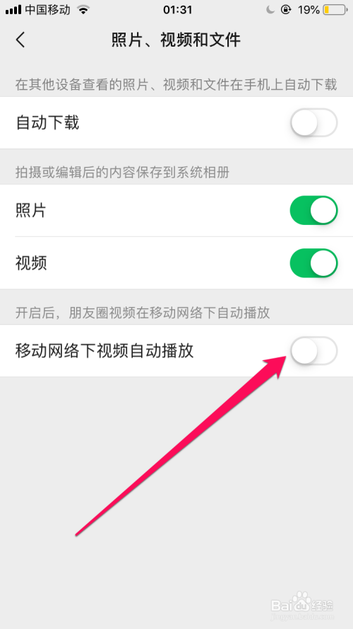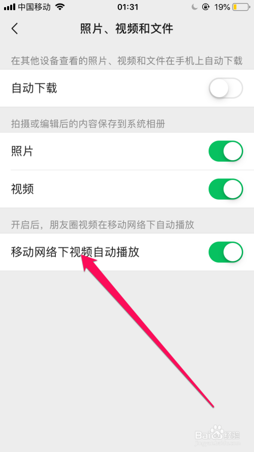在照片、视频和文件的界面选项中在移动收集下视频主动播放栏中已经”开启“的状况。