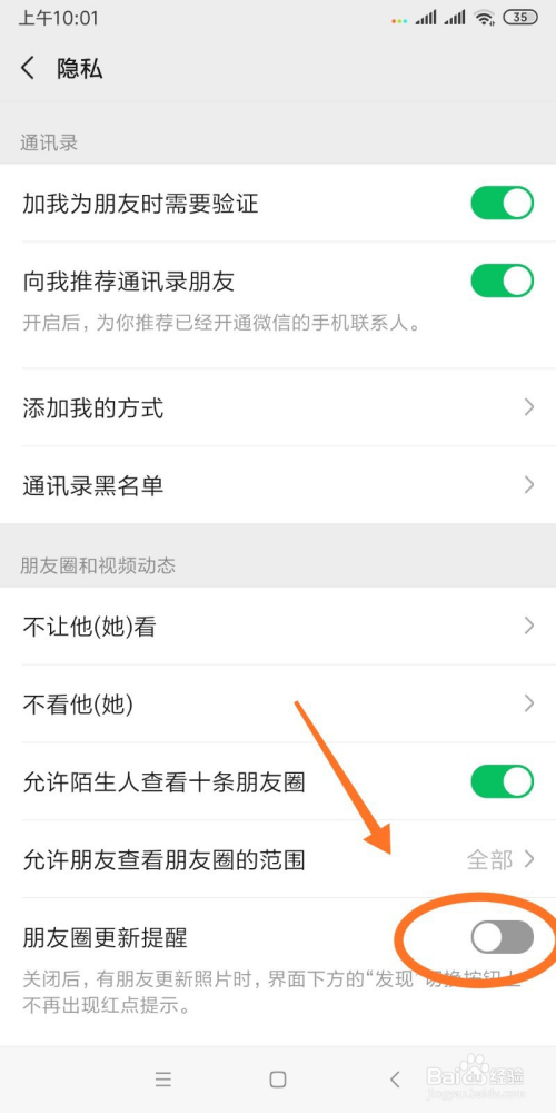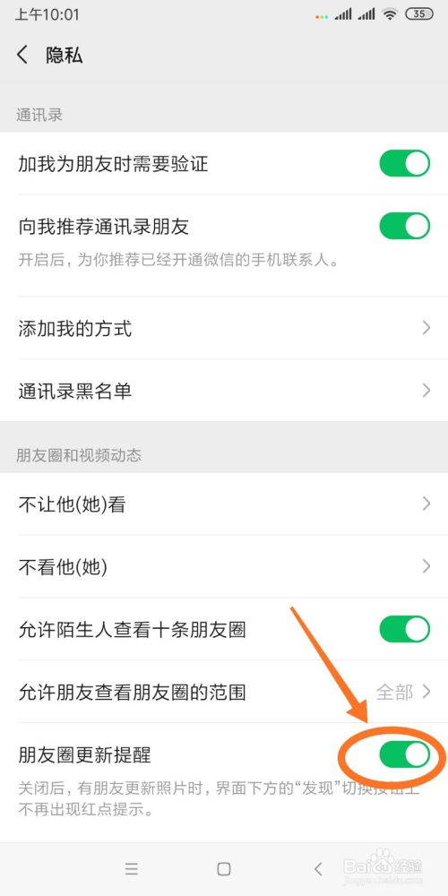 - 4在“隐私”页面的最下方可以看到朋友圈更新提醒是开启的,点击右侧的绿色按钮。