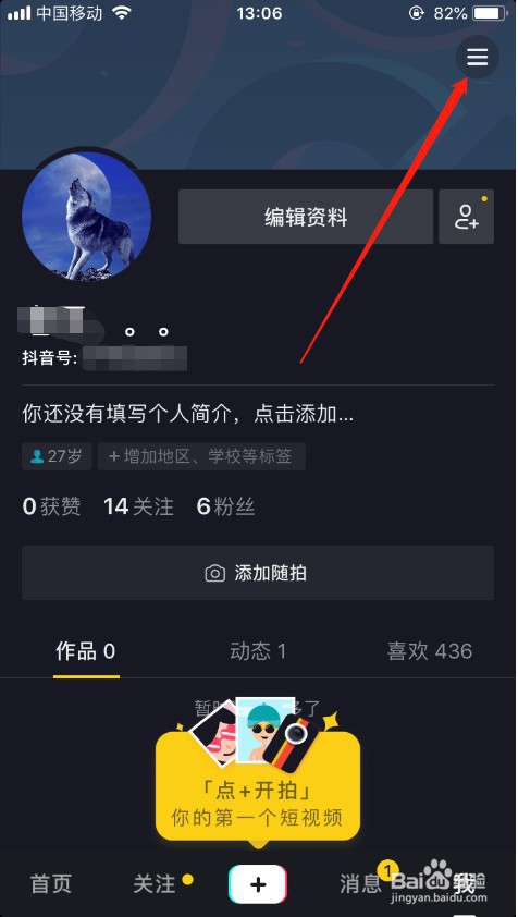 首先,打开登录抖音之后,进入抖音的小我中间,然后点击右上角的按钮,如图所示。