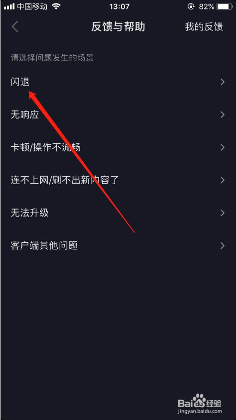 进入选择问题发生的场景之后,选择“闪退”,如图所示。