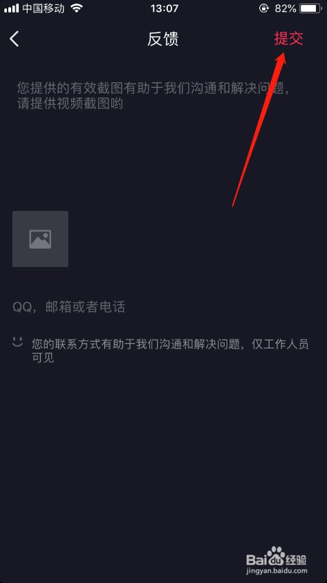 然上传问题截图,最好清楚一点,点击右上角的“提交”按钮,期待抖音查看的反馈就可以了,如图所示。