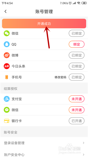 绑定当作功后会在顶部提醒【开通当作功】,然后银行卡的状况就变为已开通了。