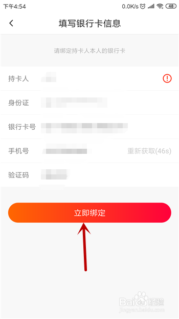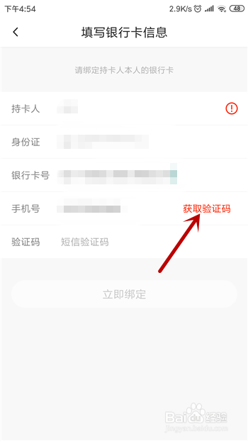 绑按时首先要输入我们的银行卡卡号和手机号码,点击 【获取验证码】。