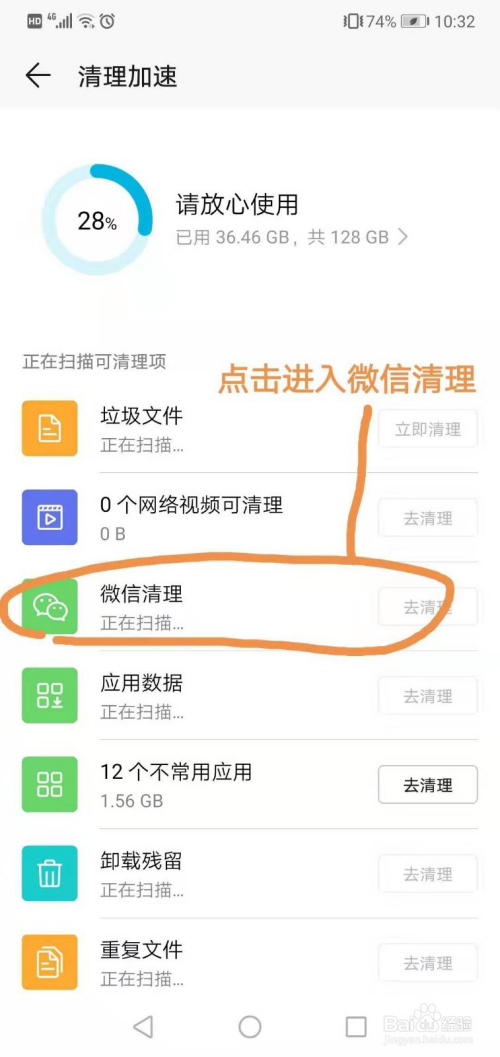 进入清理加快页面,系统正在臊面相关缓存数据,扫描完当作后点击‘微信清理’