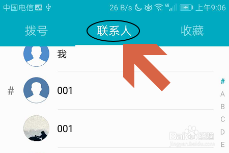 点击左侧的通信录图标,然后在跳转到的“联系人”页面即可看到手机内所有保留的联系人列表了,在列表的最上方默认的有一项“群组”,见图二...