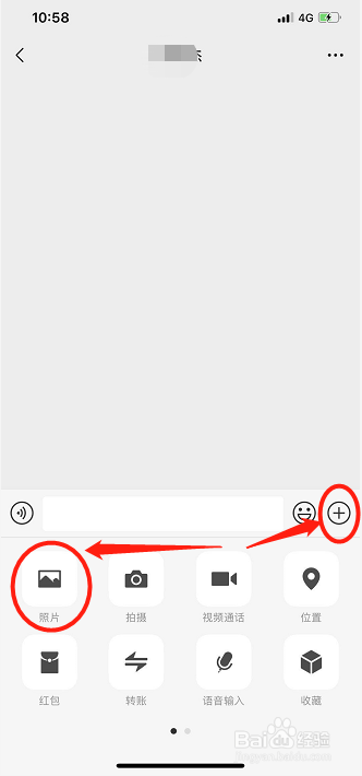 第三步:打开手机微信,进入微信老友聊天界面,点击“+”、“照片”;