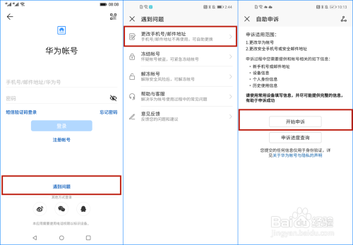 ②未登录:进入手机“设置”>“华为帐号”>“碰到问题”>“更改手机号/邮件地址”> “起头申诉”。