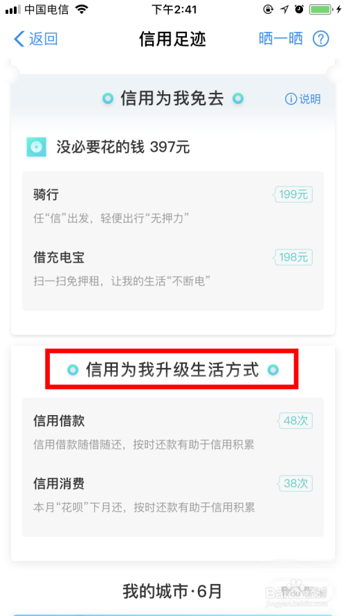 信用萍踪包罗三个方面的数据:信用为我免除(省去几多钱)、信用为我进级糊口体例、我的城市。