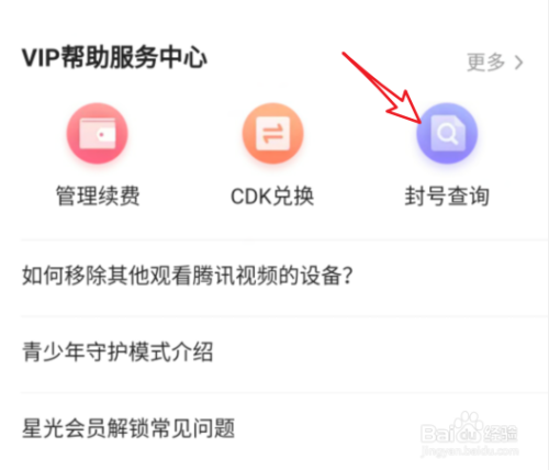 进入VIP会员界面,下滑到底部选择封号查询的图标。