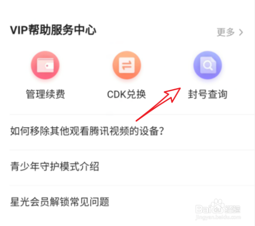进入VIP帮忙办事中间后,选择下方的封号查询。