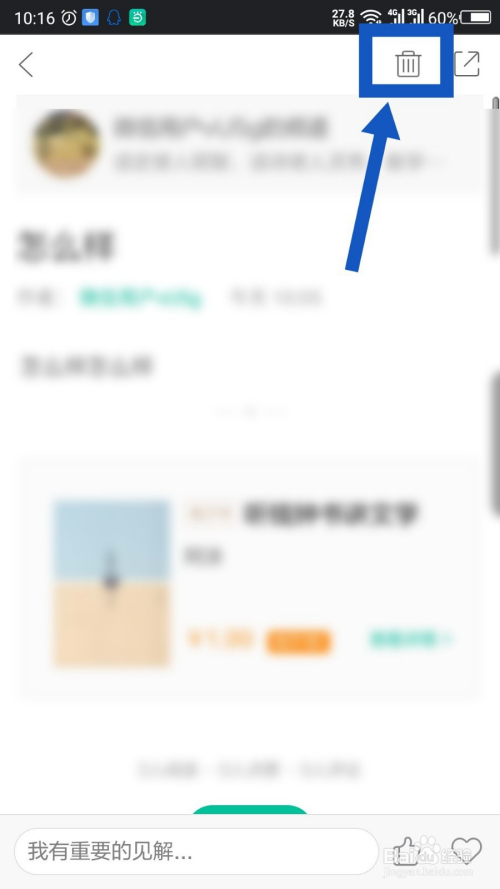 在打开的文章详情界面,点击右上角的垃圾箱图标。如图所示