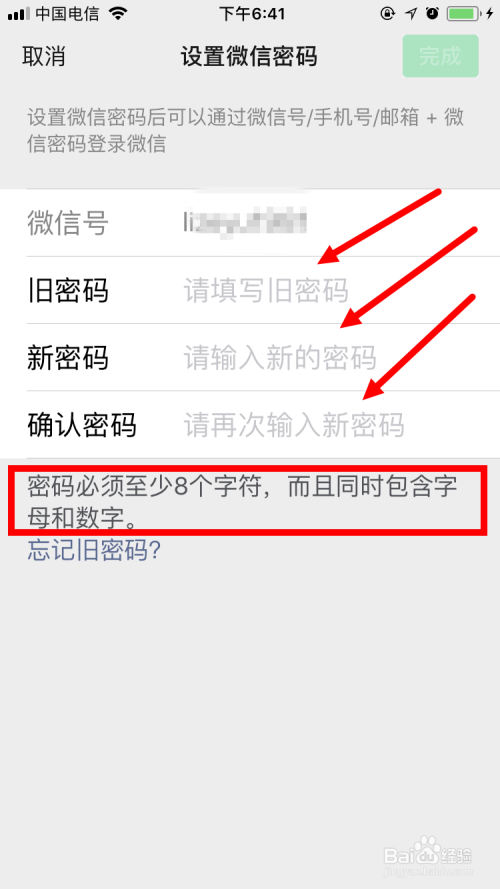 接着,在 设置微信密码 的页面,先输入旧的登录密码,再输入新的登录密码以及确认登录密码。密码起码是8个字符,必需包罗字母和数字。