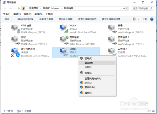 右击以太网点击状况,便可查看当地获取或者设置的地址;