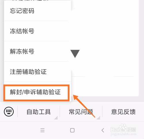 在如图所示的上拉菜单中选择最后一个选项“解封/申诉辅助验证。”