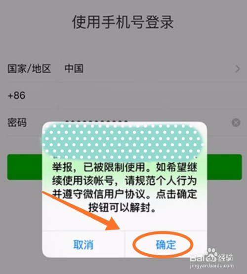 当我们的微信账号被封号时,会跳出如图所示的提醒框,点击——确定。