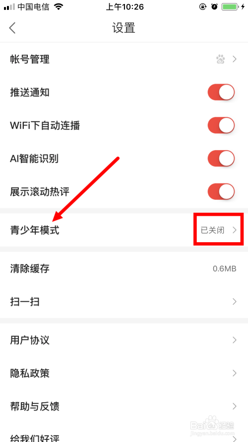 这样会进入 设置 的页面,在该页面点击 青少年模式 。系统默认这个功能是封闭的。若是需要的话,到手动开启。