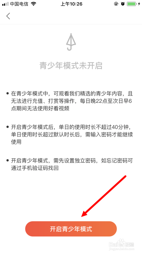 然后,鄙人一个页面中点击 开启青少年模式。