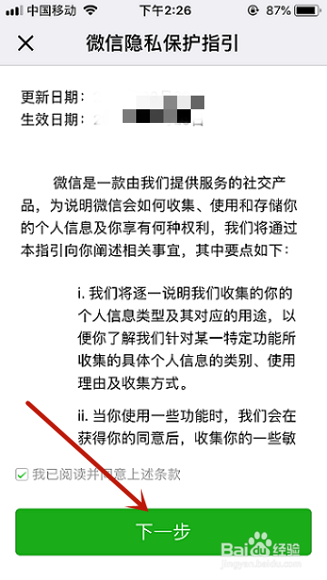接着需要当真阅读并赞成【微信隐私庇护指引】,点击下一步
