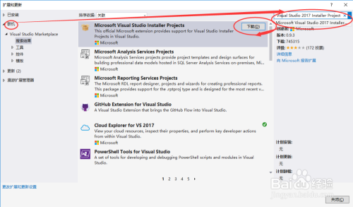 左侧选择“联机”,右侧搜刮“Microsoft Visual Studio 2017 Installer Project”,呈现“Microsoft Visual Studio Installer Projects”后,点击“下载”如下图所示: