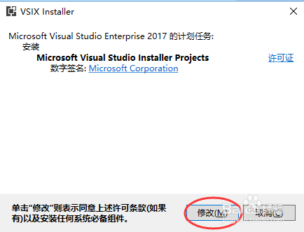 弹出VSIX Installer安装提醒,点击“点窜”,如下图所示: