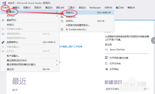 依次点击菜单栏中的“文件”->“新建”->“项目”,如下图所示: